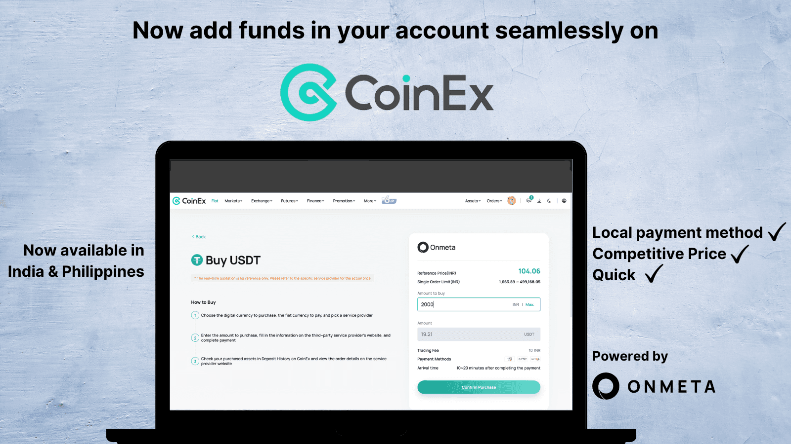 Onmeta is providing a seamless experience for the users at Coinex by allowing them to buy and sell USDC, USDT, ETH . With user-friendly onramp and offramp solutions provided by Onmeta, users can now effortlessly acquire USDC, USDT, ETH and start their exciting journey with Coinex. This hassle-free onramp experience will help users to trade seamlessly on Coinex.