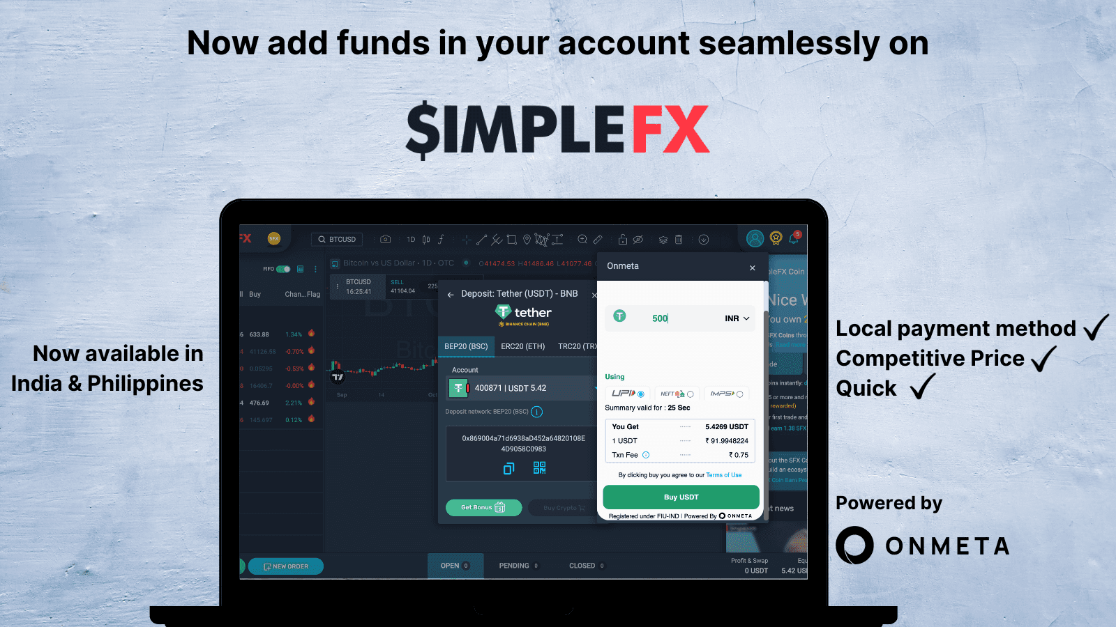 Onmeta is providing a seamless trading experience for users on SimpleFX by allowing them to buy various tokens. With user-friendly onramp solution provided by Onmeta, users can now effortlessly acquire tokens and start their thrilling journey with SimpleFX.